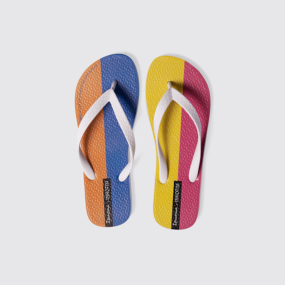Sandália unissex com estampa exclusiva, inspirada na obra Invenção da cor, Penetrável Magic Square #5 (1977), de Hélio Oiticica.
